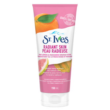 Polish away little imperfections with a delicious, citrusy scrub containing pink lemon and mandarin peel extract. When life gives you lemons, make a delicious citrusy scrub. It has a moderate exfoliation level for radiant skin. Use St. Ives Even & Bright Pink Lemon & Mandarin Orange Scrub 3‐4 times a week for beautifully polished skin that glows.