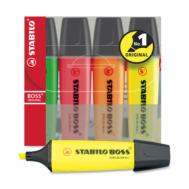Boss highlighters feature a sleek, modern shape that fits comfortably in the hand and large ink supply for long life. Chisel tips are designed for thick 5mm or thin 2mm lines. Water-based ink with long-lasting fluorescence marks on virtually all writing surfaces. Highlighters offer a high cap-off time. Nontoxic.