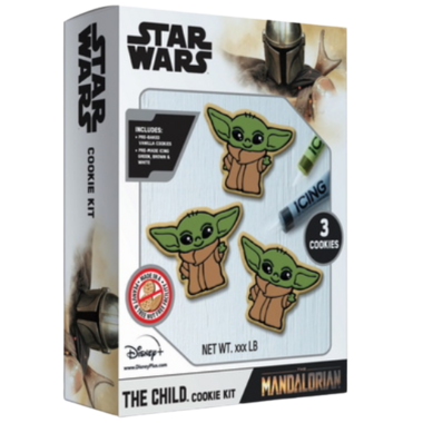 Star Wars The Child Cookie Kit features 3 Baby Yoda cookies from The Mandalorian. Includes pre-baked vanilla cookies and pre-made icing in green, brown and white.