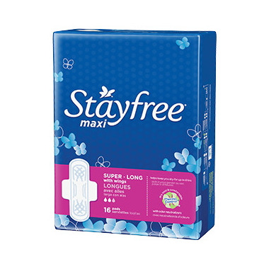 Stayfree Maxi Super Long pads feature reinforced four wall protection, designed for leak protection side-to-side and front-to-back.