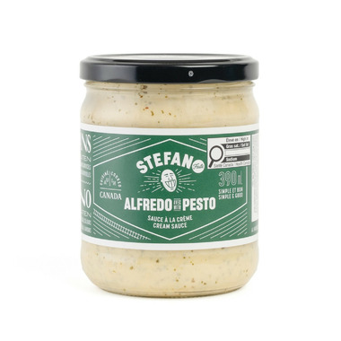 Cream (milk, cream), Water, Basil, Pecorino romano cheese, Butter, Modified egg yolk (frozen egg yolk, salt, enzyme), Modified corn starch, Parmigiano reggiano cheese, Parmesan cheese, Salt, Sodium phosphate, Xanthan gum, Natural flavour, Black pepper, Canola oil, Lipolyzed cream, Roasted garlic concentrate (modified coconut oil [medium chain triglycerides], garlic extract), Onion powder, Basil extract, White pepper. Contains: Milk, Eggs.