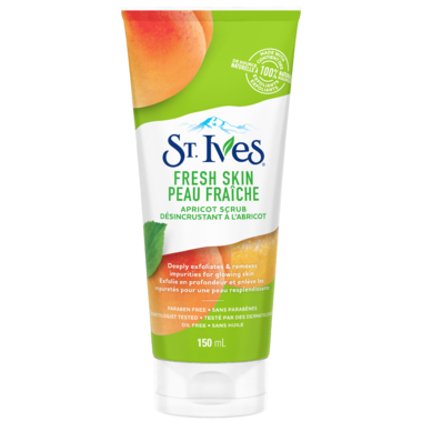 - St. Ives Fresh Skin Apricot Facial Scrub deeply exfoliates and removes impurities for glowing skin