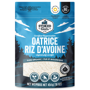 Stoked Oats Certified regenerative Oatrice Pure Organic has 6g of protein per serving.