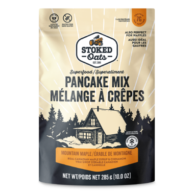 Stoked Oats Pancake Mix Mountain Maple is made with real Canadian maple syrup and cinnamon. Also perfect for waffles!
