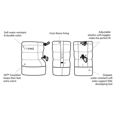 Perfect for your little explorer out in cold weather, Stonz Puffer Toddler Booties keep their feet dry & warm even in the middle of winter. The Stonz Puffer Toddler Booties use 3M thinsulate to keep them cozy in temperatures as low as -20ºC. Easy to get on and off for any impromptu backyard play session, these soft-sole non-slip shoes are perfect for early walkers that still have wobbly steps.