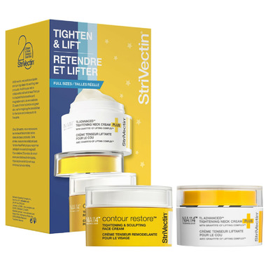 Contour Restore Face Cream: Key Ingredients: Thyme Extract Liposomes, Elastin-Targeting Dipeptides, and Glycolipids Aqua/Water/Eau, Neopentyl Glycol Diethylhexanoate, C12-15 Alkyl Benzoate, Glycol Distearate, Palmitic Acid, Glycerin, Stearic Acid, Undecane, Cetearyl Alcohol, Myristyl Nicotinate, Cetyl Alcohol, Acetyl Dipeptide-1 Cetyl Ester, Beta-Glucan, Thymus Vulgaris (Thyme) Flower/Leaf Extract, Paeonia Albiflora Root Extract, Commiphora Mukul Resin Extract, Tetrahydrodiferuloylmethane, Ornithine, Phospholipids, Glycolipids, Butyrospermum Parkii (Shea) Butter, Sodium Hyaluronate, Sucrose Palmitate, Adenosine, Hydroxyethylcellulose, Allantoin, Panthenol, Helianthus Annuus (Sunflower) Seed Oil, Potassium Cetyl Phosphate, Caprylic/Capric Triglyceride, Levulinic Acid, Glyceryl Caprylate, Butylene Glycol, Tridecane, Propanediol, Isostearyl Isostearate, Acrylates/C10-30 Alkyl Acrylate Crosspolymer, Glyceryl Linoleate, Pentylene Glycol, Polysorbate 60, Cetyl Stearate, Lecithin, Tocopherol, Caprylhydroxamic Acid, Sorbitan Laurate, Disodium EDTA, Ethylhexylglycerin, Caprylyl Glycol, Parfum/Fragrance, Citric Acid, p-Anisic Acid, Benzyl Alcohol, Sodium Hydroxide, Phenoxyethanol, Potassium Sorbate, Limonene, Citral [ILN 10884]   TL Advanced Neck Cream: Key Ingredients: Peptides, Hyaluronic Acid, Ceramide Blend, Gravitite-CF Lifting Complex?, NIA-114?, and Botanically Derived Brightening Complex Aqua (Water, Eau), Butyrospermum Parkii (Shea) Butter, Butylene Glycol, Glycerin, Isononyl Isononanoate, Caprylic/Capric Triglyceride, Myristyl Nicotinate, C12-15 Alkyl Benzoate, Glyceryl Stearate, PEG-100 Stearate, Hydrogenated Ethylhexyl Olivate, Dimethicone, Stearyl Alcohol, Cetyl Alcohol, Pentylene Glycol, Steareth-2, Behenyl Alcohol, Ethylene/Acrylic Acid Copolymer, Brassica Campestris (Rapeseed) Seed Oil, Sorghum Bicolor Stalk Juice, Sorbitan Laurate, Tetrapeptide-21, Ceramide NG, Hydrolyzed Hyaluronic Acid, Plukenetia Volubilis Seed Oil/Oleic Acid Aminopropanediol Amides/Esters, Acetyl Dipeptide-1 Cetyl Ester, C13-14 Isoparaffin, Fragrance (Parfum), Polyglyceryl-3 Diisostearate, Glycyrrhiza Glabra (Licorice) Root Extract, Cyathea Cumingii Leaf Extract, Arctostaphylos Uva Ursi Leaf Extract, Zingiber Officinale (Ginger) Root Extract, Plantago Lanceolata Leaf Extract, Nannochloropsis Oculata Extract, Althaea Officinalis Root Extract, Oryza Sativa (Rice) Bran Extract, Bisabolol, Pullulan, Panthenol, Hydrogenated Olive Oil Unsaponifiables, Laureth-7, Polyacrylamide, Acrylates/C10-30 Alkyl Acrylate Crosspolymer, Sodium Polystyrene Sulfonate, Xanthan Gum, Hydroxyethylcellulose, Sodium Hydroxide, Lactic Acid, Tetrasodium EDTA, BHT, Caprylyl Glycol, Phenoxyethanol, Chlorphenesin, Poloxamer, Silica.