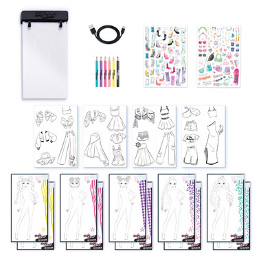 Become your own designer. This set includes a light up board filled with clothing designs, clothing stencils, stickers, colouring pencils. Every young fashion designers dream.
