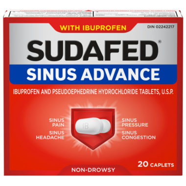 Caution: Keep out of reach of children. This package contains enough medicine to seriously harm a child. Do not give to children under 12 years unless a doctor tells you to. Do not take this product if you are also taking acetylsalicylic acid (ASA) or if allergic to ASA, ibuprofen, or other salicylates or anti-inflammatory drugs, or any of SUDAFED® Sinus Advance’s ingredients. Talk to a doctor before using this product if you have peptic ulcers, serious kidney or liver disease, high blood pressure, heart or thyroid disease, diabetes, glaucoma, or difficulty urinating due to enlargement of the prostate gland or are taking any other drug. Talk to a doctor before using this product if you are elderly, pregnant, breast-feeding, or taking a drug for depression, including monoamine oxidase (MAO) inhibitor drugs. Check with a doctor if your symptoms have not improved in 5 days or if you also have a fever. It is hazardous to take more than the maximum recommended dose unless a doctor tells you to. If abdominal pain, heartburn, nausea or vomiting, bloating, diarrhea or constipation, ringing or buzzing in the ears, nervousness, sleeplessness, dizziness or any change in vision, fluid retention, itching, skin rashes or any other side effect or unexplained symptoms develop while taking this product, discontinue use immediately and contact a doctor. In case of accidental overdose contact a doctor or Poison Control Centre immediately, even if there are no symptoms. Do not use if blister unit is broken. Store between 15 °C and 25 °C. Protect from light. Keep dry.