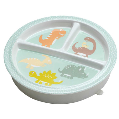 The Baby Dinosaur Divided Suction Plate features playful dinosaurs frolicking. The Divided Suction Plate has three divided sections and a removable suction base that is designed to help keep the plate in place on most smooth surfaces.