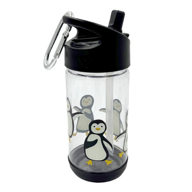 The Penguin Flip & Sip features merry dancing penguins. The Clear Tritan Flip & Sip is a sleek crystal-clear drink container made from high quality Tritan that is impervious to odors and stains. Each Flip & Sip has a colorful, contrasting lid with a carabiner to attach to backpacks or lunch bags.
