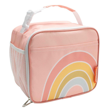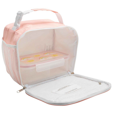 The Rainbows & Sunshine Super Zippee Lunch Tote features one large rainbow on a soft pink background! The Super Zippee is sized just right for hungry little kids or