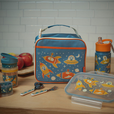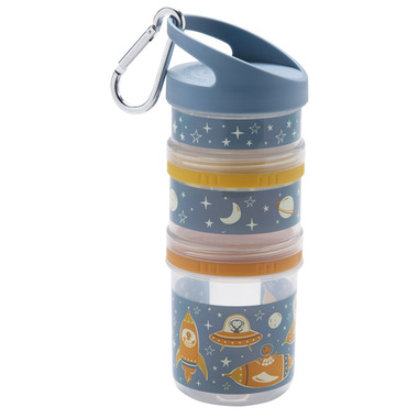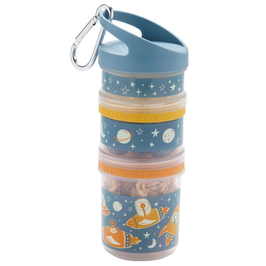The Zoom Twist & Snack Stacker features zoo animals flying spaceships into space! Twist & Snack Stacker is a stacking container for snacks, smoothie ingredients, or powdered formula. Stackers eliminate the need for plastic bags and keep food stacked, separated, and simple. Easily pack a three-tiered snack in one step!