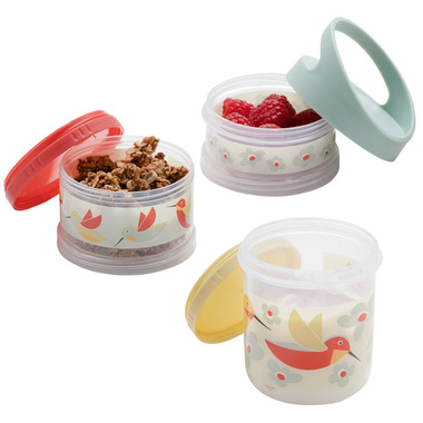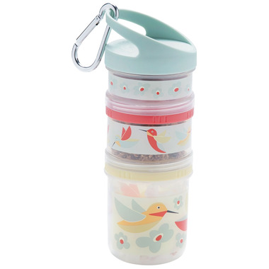 The Hummingbird Twist & Snack Stacker features happy, colorful hummingbirds flying and frolicking among a field of flowers. Twist & Snack Stacker is a stacking container for snacks, smoothie ingredients, or powdered formula. Stackers eliminate the need for plastic bags and keep food stacked, separated, and simple. Easily pack a three-tiered snack in one step!