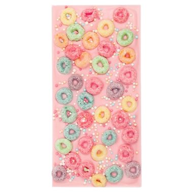 Pastel pink chocolate topped with a layer of fruity cereal and rainbow sprinkles.