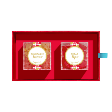 Champagne Bears: Sugar (glucose syrup, sugar), gelatin, citric acid, natural & artificial flavor, lactic acid, champagne, black currant, black carrot, beeswax, carnauba wax.