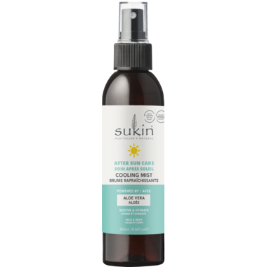 Hydrates and cools sun-exposed skin. Sukin's After Sun Cooling Mist delivers a cooling burst of hydration for your face and body. Infused with Aloe Vera, Cucumber, and Chamomile, it's your ultimate summer companion for soothing sun-kissed skin. Spritz it anytime for a quick escape to cool comfort.