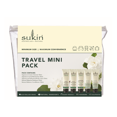 This Travel Pack Contains: 50ml each - Sukin Foaming Facial Cleanser, Facial Moisturizer, Natural Balance Shampoo, Natural Balance Conditioner & Botanical Body Wash.