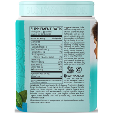 Ingredients: Proprietary Beauty Blend (Organic Fermented Pea Protein, Organic Fermented Brown Rice Peptides, Organic Sea Buckthorn Berries, Organic Tremella Mushroom Extract, Organic Kale, Organic Spinach, Organic Amla Extract, Hyaluronic Acid, Organic Bamboo Extract, Organic Spirulina, Organic Holy Basil Extract, Organic Sunflower Seed Extract), Organic Guar Gum, Organic Soluble Rice Bran, Medium Chain Triglycerides Oil Powder (Coconut Oil Acacia Fiber), Marine Algae.