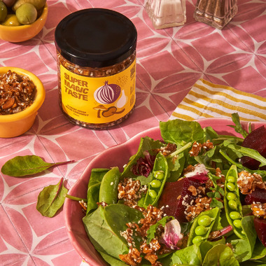 A crispy, crunchy, umami rich garlic-forward finishing oil. Perfectly seasoned, and full of aromatic onion, garlic, sesame, and mushroom flavour to elevate any dish. All of the flavour, without the spice of this Chili Crisp. Dangerously addictive.