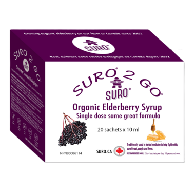 Suro organic elderberry syrup is now available in individual sachets. Fight cold and flu symptoms such as coughs and sore throats, and enjoy a 100% organic formula featuring elderberry, propolis and echinacea.