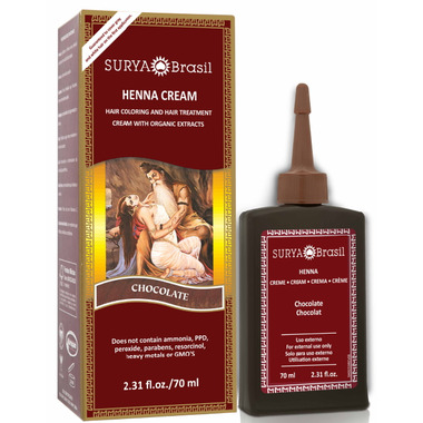 Surya Henna Cream is a semi-permanent hair coloring containing hair dyes plus herbs and fruits from Brazil and India, which offer simultaneous coloration and deep conditioning treatment for the hair. Intense treatment for hair and scalp. Colors gray on first application.