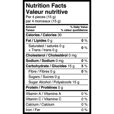 Ingredients: Isomalt, citric acid, malic acid, natural and artificial flavours, acesulfame potassium, artificial colours.