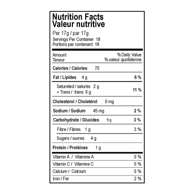 Pure gluten free rolled oats, organic evaporated cane juice, organic coconut oil, pure gluten free oat flour, whole grain brown rice flour, sunflower oil, potato starch, unsweetened & unsulphured desiccated coconut, organic blackstrap molasses, organic flax seeds, baking soda, sea salt.