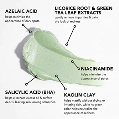 Key Ingredients: Azelaic Acid helps to minimize the appearance of dark spots that bumps can leave behind and unclog pores. Salicylic Acid (BHA) helps eliminate excess oil and surface debris, leaving skin looking smoother. Niacinamide helps minimize the appearance of pores. Mineral-Rich Kaolin Clay helps mattify without drying or irritating skin while its green color helps neutralize the appearance of redness. Licorice Root and Green Tea Leaf Extracts gently remove impurities and calm the look of redness.