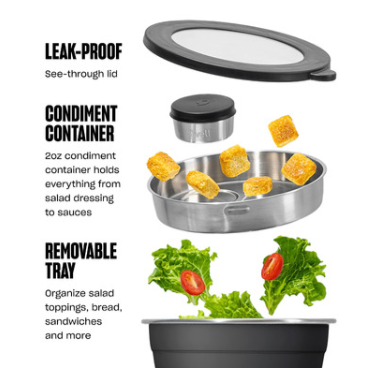 Upgrade your salad in organized style with the all-in-one Salad Bowl Kit, the perfect companion for at-home meal prep and on-the-go eating. Kit includes one 64oz (1.9L) Salad Bowl - total capacity - with a 2oz (60ml) Condiment Container and removable tray. A leakproof, see-through lid and closable condiment container help organize salad toppings, bread, sandwiches or even your reusable utensils. S'well Condiment Container Set with lids is also available for added meal organization.