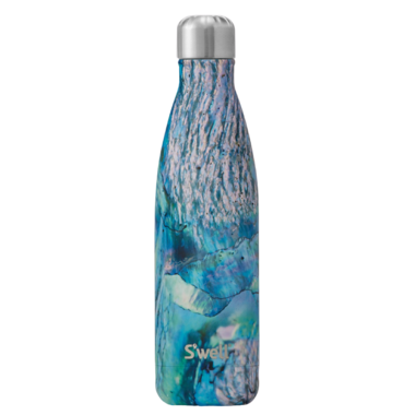 Original Bottle, 500 ml (17 oz), paua.  S'well Bottles feature Therma-S'well™ technology - a triple-layered, vacuum-insulated construction made of high quality, 18/8, food-grade stainless steel walls plus a copper wall layer for superior temperature retention.  It means that beverages will stay cold for up to 41 hours and hot for up to 18, while maintaining a condensation-free exterior. The 500 ml (17oz) bottle emulates a standard size water bottle and is perfect for staying hydrated at the gym or anywhere on-the-go. Bottle top is secure-fitting, leak-free and the opening fits most ice cubes.  The bottle conveniently fits in standard-sized cup holders.  By choosing re-usable S'well bottles you can help reduce the use of single-use plastic products that pose a threat to our environment.