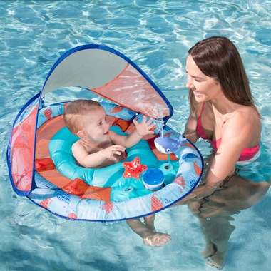 Introduce your baby to the pool in the SwimWays Baby Spring Float Splash Station with Canopy baby float! The baby float includes interactive water toys when activated, squirt and spray water for fun pooltime play with baby. In between the two water toys, there is a mesh baby sippy cup holder convenient for parents and baby.