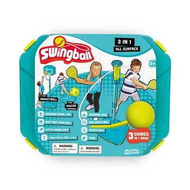 Swingball 3-in-1 is designed after the classic Swing ball to be played on various surfaces, this set includes Swing ball, basketball and soccer. All three games fit into the base case. For ages 3+. Height: 43”