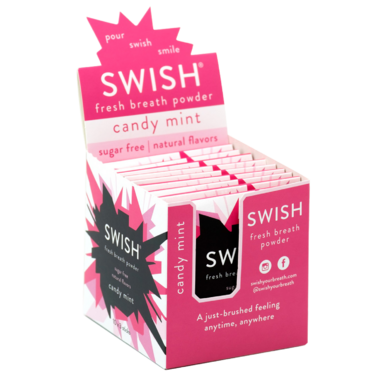 Forget gum or mints. Sugar-free SWISH is the better choice for a super clean smile and extra fresh breath. SWISH doesn't mask bad breath; it eliminates odors at their source. Plus, it optimizes the pH level in your mouth for a just-brushed feeling anytime, anywhere. No water, toothbrush or floss needed. Just pour, swish, smile!
