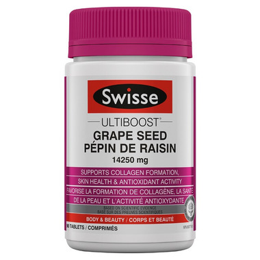 Swisse Ultiboost Grape Seed is a premium quality formula to help: support collagen formation to maintain healthy bones, cartilage, teeth and gums; relieve symptoms related to non-complicated chronic venous insufficiency (CVI), such as sensation of swelling, heaviness and tingling of the legs; support wound healing; provide antioxidants that help reduce the oxidative damage caused by free radicals.