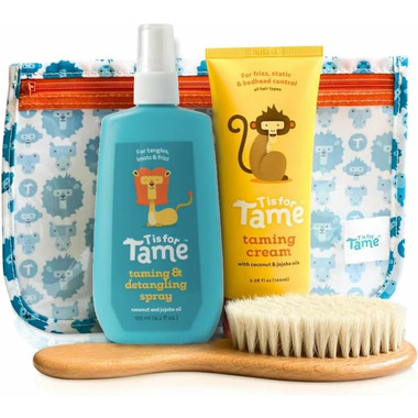 This all-in-one kit features the best kids' hair products: the Taming Cream, Taming Spray, and a Soft Bristle Wood Brush, along with a BONUS reusable accessory bag. The Taming Cream is a lightweight, natural, and organic styling cream that expertly calms flyaways, frizz, bed head, and static, ensuring picture-perfect, frizz-free hair for babies and toddlers.