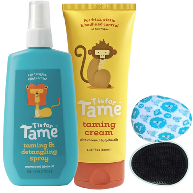 This kit includes everything you need to keep your childs hair looking picture-perfect. The Taming Cream is a lightweight, natural, and organic styling cream that effortlessly calms flyaways, frizz, bed head, and static, leaving your baby or toddler's hair frizz-free and healthy. The Taming Spray is a moisturizing leave-in spray conditioner that detangles, protects, hydrates and keeps hair frizz-free and touchably soft, even before styling. Formulated with a nourishing blend of coconut and jojoba oil, it helps prevent breakage and holds styles all day. The kit also includes a unisex mini baby brush that gently combs through straight, wavy, and curly hair without causing breakage. Its small size is perfect for little hands, helping children learn early brushing habits. Each product ensures your childs hair feels soft and natural to the touchnever stiff, sticky, or oilyחmaking this kit ideal for all ages and hair types.