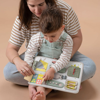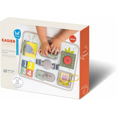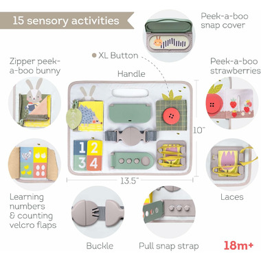 An innovative & engaging toy designed for toddlers 18 months & up. Features zipper, XL button, hook and loop closure flaps, laces, snap cover, buckle, pull snap strap, peek-a-boo activities, numbers, amounts, & counting. Enhances fine motor skills, dexterity, problem-solving, & hand-eye coordination. Perfect for interactive play & learning. The only toy that is specially designed for the developmental stage of toddlers 18 months & up, that doesn't contain small parts & is safe for toddlers under the age of 3.
