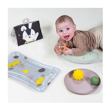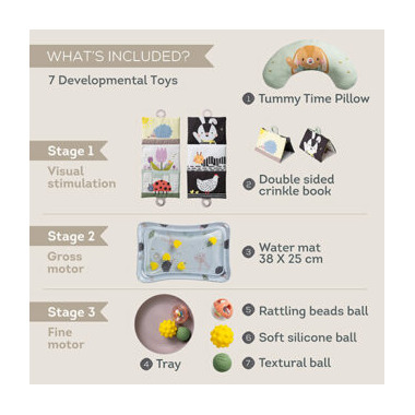All you need for the best tummy-time experience! The tummy time kit features 7 developmental toys, including a classic tummy time pillow, an engaging water mat for added sensory activity, a double-sided crinkle tummy time book, and a plate with three sensory activity balls in various colors and textures.