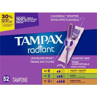 Its a new time for that time of the month. Get up to 100% leak and odor-free protection with Tampax Radiant tampons designed with a LeakGuard Braid to help stop leaks before they even happen. For protection you can feel good about. Got leaks? Go up an absorbency. Uncomfortable to remove? Go down an absorbency. Free of dyes, perfume, latex*, BPA, and elemental chlorine bleaching. Thanks to their Textured Grip, they are specifically designed for incredibly comfortable tampon insertion. Plus, they come in a CleanSeal Wrapper created for more** ease, more clean, and more hygiene - to help dispose of them wherever you are.