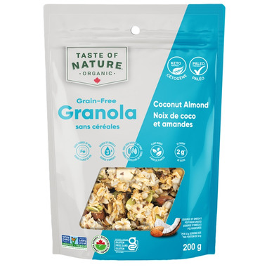Taste of Nature Grain Free Granola Coconut Almond is made with natural ingredients like flaxseeds, almonds and coconut. A very high source of fibre, a source of omega -3 polyunsaturates, and a good source of iron and zinc, this plant based granola is as nutrient rich as it is flavorful.