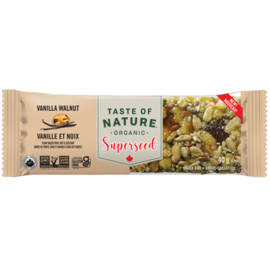 Taste of Nature Organic vanilla walnut superseed bars are made with plant based fruit, nuts and seeds. These bars are also Gluten Free and Non-GMO.