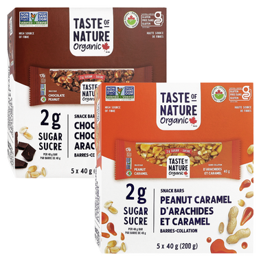 Taste of Nature Multipack Low Sugar Bars Peanut Caramel -Peanuts*, Soluble Tapioca Fibre* and/or Inulin*, Gluten-free Oats*, Sunflower Seeds*, Glycerin*, Whole Grain Crisp Brown Rice*, Sugars* (Brown Rice Syrup*, Molasses*, Monk Fruit Concentrate*), Peanut Butter*, Natural Flavour*, Sunflower Oil Blend* (sunflower oil*, mixed tocopherols, rosemary extract*), Sea Salt, Agar. *organic Contains: peanuts May contain almonds, cashews, walnuts, pecans, Brazil nuts, soy, eggs, and sesame. May contain pits and shells.