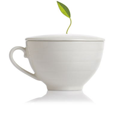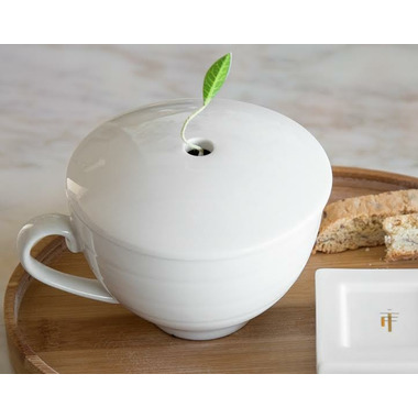 Cafe Forte's elegant, porcelain tea cup is one of the brands signature teacups. The custom cover keeps tea hot, while the hole in the the lid reveals the leaf of their iconic pyramid infusers. After steeping, remove the lid to enjoy an aromatic cup of tea. Steeps 8 oz.