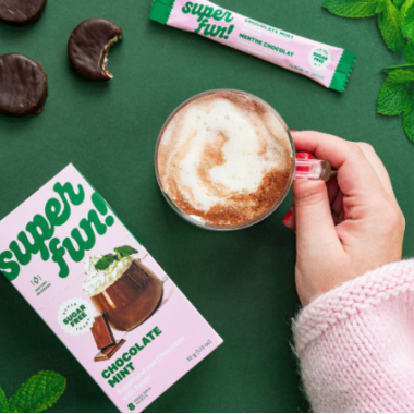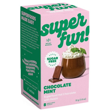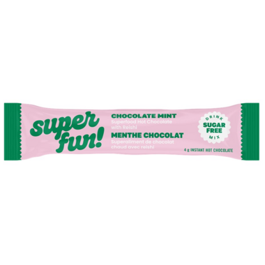 Channel mint chocolate chip ice cream but make it healthy. Blended with stress-soothing Reishi and mellow, digestion-aiding mint, weve upgraded this classic hot chocolate treat and made it SUGAR-FREE. It's not your grandma's hot cocoa; it's a mood-boosting, treat-yourself experience that's all about taste and feeling your best. All superfun! drinks are lightly sweetened with stevia, giving you a delicious sweet treat without the sugar!