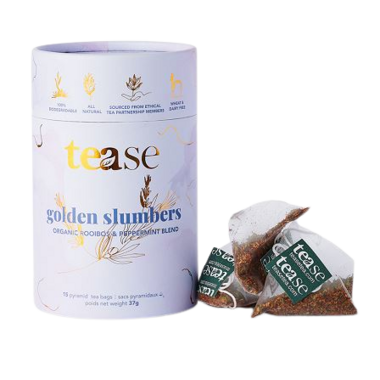Golden Slumbers Valarian Root Blend Tea is a calming blend to guide you from a long day, straight into dreamland with peppermint and rooibos.