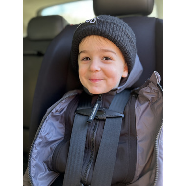 The Duo is a warm, stylish jacket that can safely be worn in car seats, all year long! To wear the Duo jacket in a car seat, unzip the puffier exterior layer of the jacket and fasten the harness over top of the thinner inner layer.