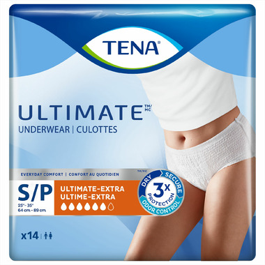 TENA Ultimate underwear is designed to protect against heavy urine leakage while remaining comfortable and discreet. It has a stronger, more absorbent core, improved leg gathers to protect against leakage, and softer and more comfortable materials against your skin. TENA Ultimate underwear provides triple protection against leaks, odour, and wetness.