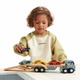 A solid wood transporter with detachable carrier, 4 stylish super cars with metal wheels and a lift down boarding ramp. Check out the little dog in the front cabin!