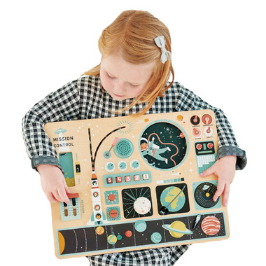 An intergalactic mission, all on one space station platform. An illustrated plywood board with lots of space rocket dashboard activities. A rotating wheel can be turned at the side to reveal an ever-changing illustrated space scene, as if looking through the window into the void of space. A magnetic strip offers a view of our universe upon which to place the planets. A fuel tank to show the levels, a booster lever to move up and down, knobs to turn, squishy buttons to press, a radar panel to locate the UFOs. Rotate a spherical moon and move satellite around earth, speak into the microphone and prepare for lift-off with a 3 part movable rocket!