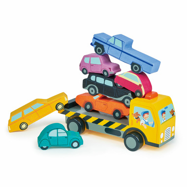 7 brightly coloured wooden toy cars on their way to the scrapyard! Test your balancing skills by stacking them on the back of the wheeled recovery truck, a fun game for all the family, developing fine motor skills and hand-eye coordination with toddlers.
